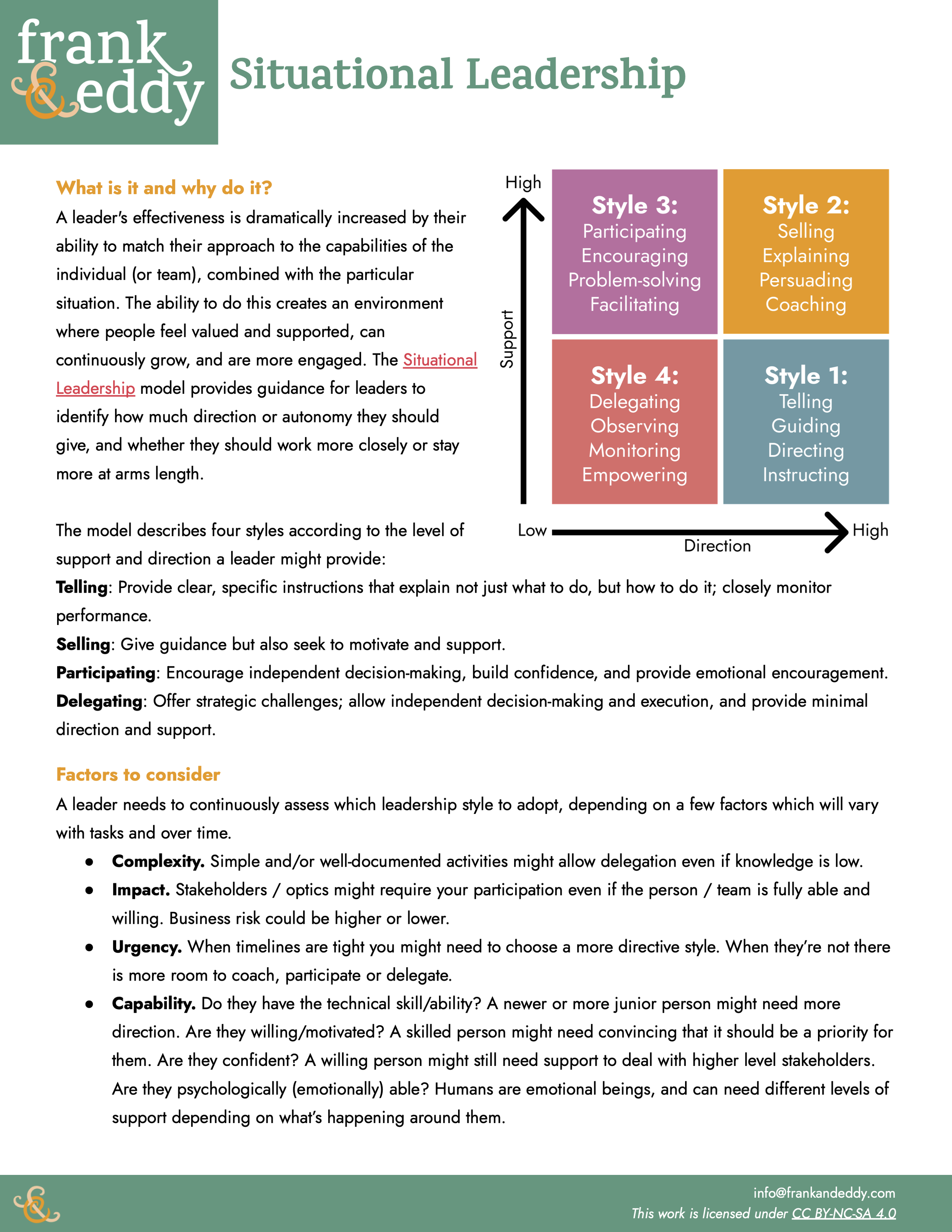 The Situational Leadership model helps leaders adapt their approach based on the capabilities of their team and the demands of the situation. By understanding when to provide direction, motivation, support, or autonomy, leaders can create an environment where people feel valued, grow continuously, and stay engaged. Originally developed by Paul Hersey and Ken Blanchard. Our summary is below.
